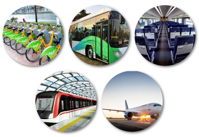公共交通方式:公共自行车、公共汽车、地铁、飞机、动车等。