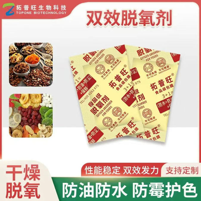 拓普旺双效脱氧剂是一种结合了铁系脱氧剂和酒精保鲜剂的高效保鲜产品,主要成分有铁粉、水、氯化钠、酒精等,能防止油脂氧化、肉类的氧化褐变以及维生素损失等问题,在保持食品的原有风味、色泽和营养价值的同时,有效的延长食品的保质期。干燥+脱氧,能最大程度地延长保质期、保持最佳口感(酥脆)、锁住天然风味和色泽、保障食品安全。